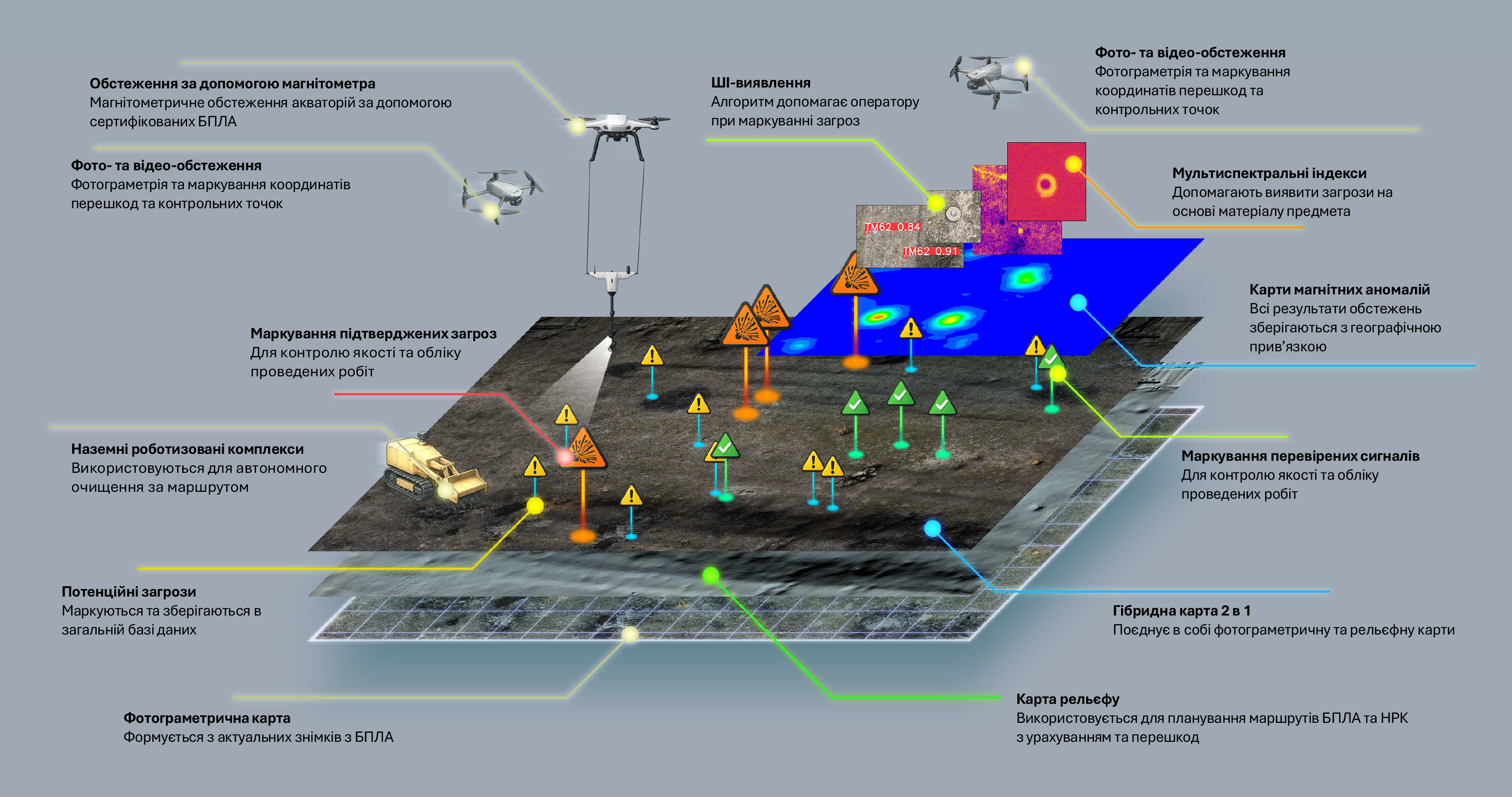 Наше рішення створене для того, щоб максимально збільшити безпеку, швидкість, ефективність та прозорість розмінування в Україні.